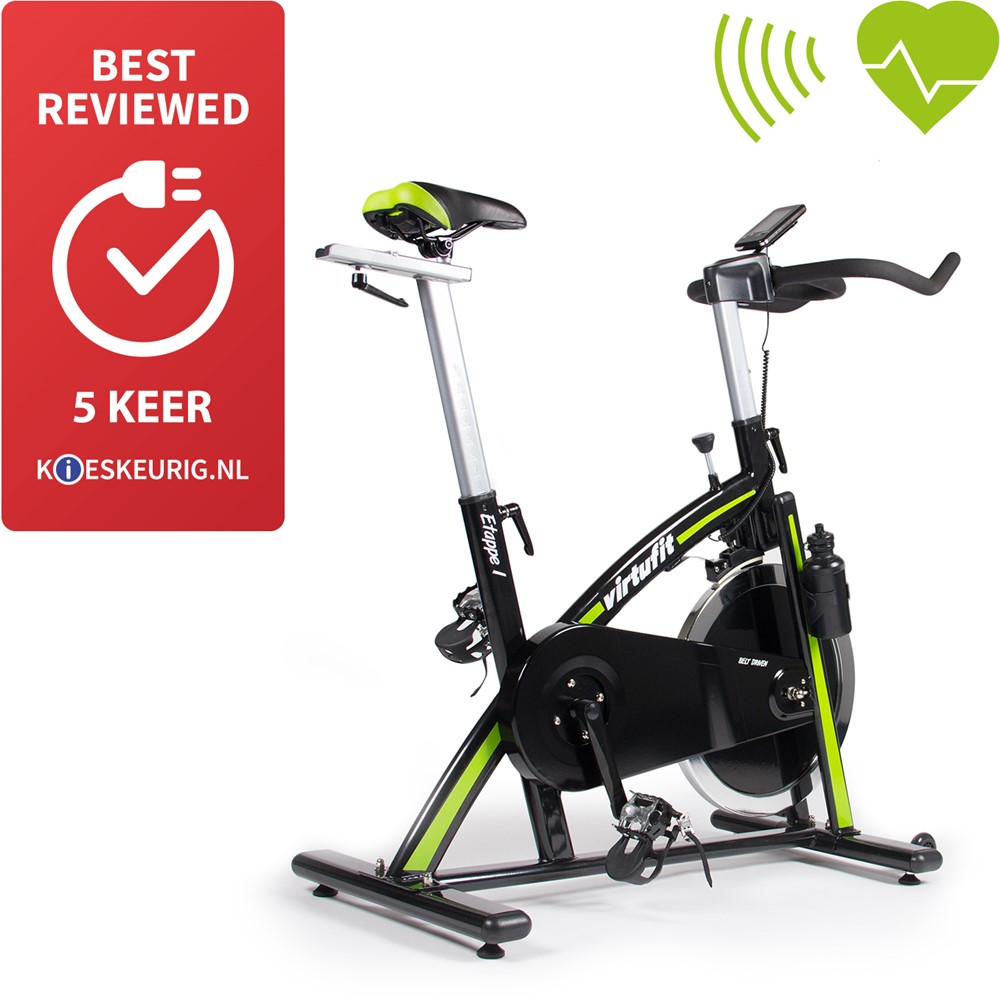 Let op: dit betreft een tweedekans artikel. Een tweedekans artikel is een artikel met een klein gebrek. De verpakking kan geopend of beschadigd zijn, er kunnen kleine krasjes aanwezig zijn op het product of het artikel is eenmalig gemonteerd en vervolgens weer uit elkaar gehaald.Voor al onze tweedekans artikelen geldt dat deze getest zijn en 100% werkend zijn. Ook geldt de originele garantie nog op dit product.Voor intensief sporten kun je het beste een stevig fitnessapparaat gebruiken. Daar is de VirtuFit Etappe 1 Spinbike voor gemaakt. Op deze spinbike kun je niet alleen fietsen, maar ook crossen of wielrennen als je daar zin in hebt. Deze extra stevige spinbike staat stabiel op de grond, is goed in staat om je bewegingen op te vangen, en is belastbaar tot 135 kilo. En hij heeft een 22 kg zware vliegwielmassa, met een gemakkelijke weerstandsknop waarmee je de intensiteit van je training een enorm stuk kunt verhogen.Pedalen en stuur om intensief mee te sportenAls je wilt crossen heb je stevige pedalen nodig die een hele oefening je volle gewicht kunnen dragen. En een trapas die goed bestand is tegen zijwaartse bewegingen. Bij de Etappe 1 zijn de massiefijzeren pedalen met een professionele drie delige crank aan de trapas bevestigd. Dit geheel is ontworpen om extreme krachten zonder problemen te verwerken. Wielrenners zullen meer interesse hebben in het stuur van de Etappe 1. Dat heeft een stevige schuimrubberen beschermlaag om tijdens lange intensieve fietstochten blaren te voorkomen. En een anti-slip textuur waardoor je een comfortabele en stevige grip hebt, zelfs met zweterige handen. Kortom, een stuur gemaakt om intensief mee te sporten.Soepel en ergonomisch fietsenMaar ook voor rustigere oefeningen is de VirtuFit Etappe 1 een goede keuze. Deze spinbike fietst namelijk gewoon lekker. Dat komt onder andere doordat alle draaipunten zijn voorzien van industriele lagers om een soepele beweging te garanderen. En de V-belt aandrijving voor een stille en vloeiende beweging van het vliegwiel zorgt. Het komt ook doordat je altijd een goede sporthouding kan vinden op deze spinbike. Hij heeft een wielrennerszadel dat je gemakkelijk horizontaal verstelt. Met een extra lange zadelstang voor lange mensen. En een stuur dat je gemakkelijk hoger of lager zet. Hiermee pas je de Etappe 1 gemakkelijk aan op je eigen lichaamslengte. Zowel hetstuur als het zadel verstel je met een "L-Bolt"; een L vormige schroef hendel die nooit los kan schieten tijdens je oefening, hoe wild je ook met de spinbike om gaat. Dat is 100% veiligheid, en zeker niet vanzelfsprekend in deze prijsklasse. Display en hartslagmetingOverzicht op je oefening houden is gemakkelijk met het display van de Etappe 1. Hier zie je de snelheid, afstand, tijd, aantal omwentelingen per minuut, hartslag, calorie verbruik en een scan functie. De hartslag ontvanger van de VirtuFit Etappe 1 meet je hartslag als je een draadloze borstband of hartslag horloge draagt. Dit is nauwkeuriger dan de contact sensoren op het stuur die de meeste andere spinbikes gebruiken, en geeft je bovendien de vrijheid om je handen te bewegen zonder je hartslagmeting kwijt te raken. Van alle gemakken voorzienWil je een keer voor de televisie spinnen, dan verplaats je deze spinbike gemakkelijk met transportwielen. En je kunt hem daarna gemakkelijk waterpas stellen, zodat ook scheve vloeren geen afbreuk aan je oefening doen. Als je dorst hebt, hoef je je spinning niet meer te onderbreken. Op de VirtuFit Etappe 1 zit een bidon houder, en je krijgt de bidon er bij.De VirtuFit Etappe 1 Spinbike is 121 x 54 x 125 cm groot (LxBxH) en weegt 41,5 kg. Hij heeft een montage- en gebruikershandleiding in Nederlands en Engels, en is verpakt in een extra stevige doos om beschadigingen tijdens transport te voorkomen.Gratis maand CycleMastersBij aankoop van deze spinbike krijg je 1 maand gratis sporten met CycleMasters cadeau. Na aanschaf ontvang je per mail een unieke actiecode die je kunt gebruiken bij aanmelding op de website van CycleMasters. De korting wordt dan automatisch toegepast.Beklim met CycleMasters de mooiste bergen in Frankrijk en Italië, neem deel aan een studio les op vette muziek, of aan een Beat Ride les waarbij je op de beat van de muziek niet alleen fietst, maar een full-body workout doet. Er zijn lessen voor beginners tot gevorderden, van HIIT trainingen van 20 minuten tot endurance trainingen van 90 minuten lang. De bekende trainers motiveren jeen zorgen ervoor dat je altijd het maximale uit je training haalt. Meer informatie over CycleMasters vind je in onze blog.VirtuFitHet Nederlandse fitnessmerk VirtuFit staat garant voor uitstekende kwaliteit. De fitnessapparaten en fitnessartikelen zijn vervaardigd uit kwaliteitsmaterialen en daarnaast is er veel aandacht besteed aan gebruikersgemak, design en uitgebreide functionaliteiten.Product specificaties