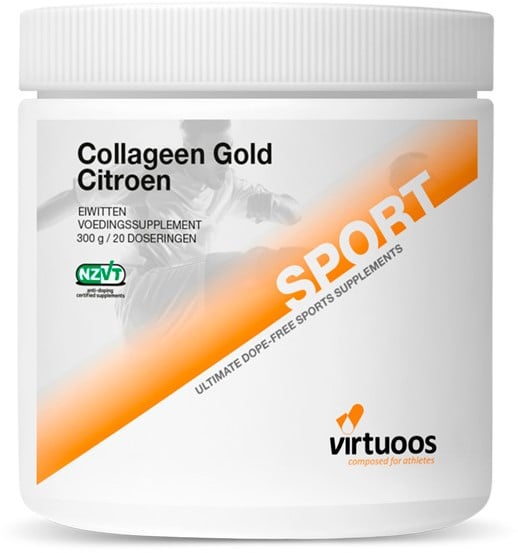 Collageen Gold bevat 15 gram collageenpeptiden en 80 mg vitamine C per dosering. Dankzij een speciaal proces zijn de collageenpeptiden al afgebroken tot kleine stukjes, waardoor je lichaam ze snel kan opnemen. Vitamine C draagt bij aan de normale vorming van collageen, wat belangrijk is voor je botten en bijdraagt aan de normale werking van je kraakbeen.Wat is collageen?Collageen is een lichaamseigen eiwit dat van nature voorkomt in je botten, kraakbeen en huid. Het onderscheidt zich van andere eiwitten door de hoge concentraties van de aminozuren glycine, proline en hydroxyproline.Belangrijkste eigenschappen15 g gehydrolyseerde collageenpeptiden per dosering Vitamine C ondersteunt het behoud van sterke botten en gezond kraakbeen Vitamine C is van belang voor de vorming van collageen, wat belangrijk is voor je botten Snelle opname door afbraak van collageenpeptiden tot kleine stukjesGeadviseerd gebruikLos 2 maatschepjes (ca. 15 gram)op in een glas water (200 ml) of in een andere drank. Bij voorkeur 45 minuten voor het sporten innemen. Maatschepje bijgesloten, 1 maatschepje is ca. 7,5 gram.BewarenDroog, koel, beschermd tegen licht en buiten bereik van jonge kinderen bewaren.WaarschuwingenDe aanbevolen dosering niet overschrijden. Een gezonde leefstijl is van belang, evenals een gevarieerde voeding. Een voedingssupplement is geen vervanging van een gevarieerde voeding.IngrediëntenGehydrolyseerde rundercollageenpeptiden (ProTake™ BH), vitamine C.Aanvullende informatieCollageen Gold bevat collageenpeptiden afkomstig van hoogwaardig rundercollageen. Collageen is een dierlijk product en dus niet geschikt voor vegetariërs en veganisten.Inhoud&productinformatieInhoud: 300 gram 20 doseringen van 15 gramProduct specificaties