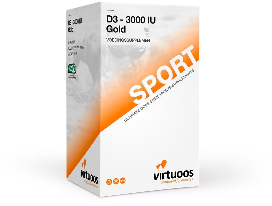 Vitamine D3-3000 IU Gold bevat een hoge dosering aan vitamine D3, 75 mcg per capsule. Ideaal voor sporters, mensen met een verhoogde behoefte of wanneer er sprake is van lage vitamine D waarden. Vitamine D is belangrijk voor je spieren, botten en weerstand.Vitamine D helpt je om sterk en fit te blijvenVoor sporters is het essentieel om voldoende vitamine D te hebben. Vitamine D helpt je om sterk en fit te blijven. Dit komt doordat vitamine D een grote rol speelt bij het behoud van sterke spieren en botten. Daarnaast ondersteunt vitamine D je weerstand, wat als sporter ook van groot belang is. Zeker in zware training- of wedstrijdperiodes, wil je dat je weerstand optimaal functioneert.Belangrijkste eigenschappen75 mcg vitamine D3 per capsule Goed voor de spieren en botten Ondersteunt de weerstand Ideaal voor sporters en bij lage vitamine DwaardenGeadviseerd gebruikDagelijks 1 capsule met een ruime hoeveelheid water innemen. Bij voorkeur in combinatie met een maaltijd.BewarenDroog, koel en donker bewaren buiten bereik van jonge kinderen.WaarschuwingenDe aanbevolen dosering niet overschrijden. Een gezonde leefstijl is van belang, evenals een gevarieerde voeding. Een voedingssupplement is geen vervanging van een gevarieerde voeding.IngrediëntenVulstof (aardappelzetmeel), hypromellose (capsulehuls), Quali®-D, antiklontermiddel (magnesiumstearaat), zonnebloemolie.Aanvullende informatieDit product is vrij van bekendeallergenen en geschikt voor vegetariërs.Inhoud&productinformatieInhoud: 90 capsules Netto gewicht: 73 gramProduct specificaties