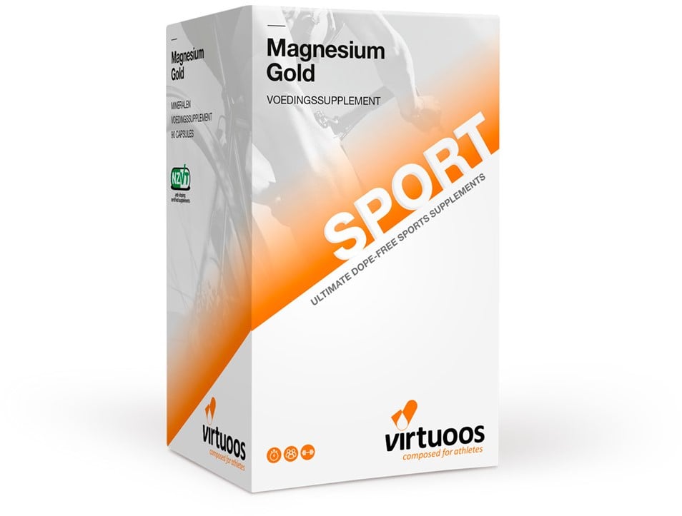 Magnesium Gold is hét magnesiumsupplement voor sporters en actieve mensen. Het bevat magnesium bisglycinaat, de best opneembare vorm van magnesium. Dit essentiële mineraal ondersteunt de werking van spieren en zenuwen, helpt vermoeidheid te verminderen en draagt bij aan een goede elektrolytenbalans. Niet voor nietskiezen veel sporters voor magnesium als dagelijkse ondersteuning.Magnesium speelt een cruciale rol in tal van lichaamsprocessen. Het helpt bij het soepel houden van de spieren, ondersteunt de prikkeloverdracht tussen zenuwcellen en draagt bij aan de opbouw van lichaamseiwit. Daarnaast is magnesiumbetrokken bij de energieproductie uit voeding en helpt het bij het verminderen van vermoeidheid en moeheid.Magnesium komt van nature voor in bijna alle cellen van het lichaam. Belangrijke voedingsbronnen zijn volkoren granen, noten en groene bladgroenten. Wanneer deze voedingsmiddelen onvoldoendeworden geconsumeerd, kan een magnesiumsupplement een waardevolle aanvulling zijn. Zeker voor sporters, bij wie de magnesiumbehoefte vaak hoger ligt.Belangrijkste eigenschappenBevat magnesium bisglycinaat voor optimale opname Ondersteunt spieren en zenuwstelsel Helpt bij vermoeidheid en moeheid Draagt bij aan de elektrolytenbalans Speelt een rol bij de opbouw van lichaamseiwitGebruik en doseringTweemaal daags 1 capsule innemen met een ruime hoeveelheid water. Bij voorkeur in combinatie met een maaltijd.IngrediëntenMagnesium complex, hypromellose (capsulehuls), antiklontermiddelen (talcum, zonnebloemlecithine), zonnebloemolie, vulstof (aardappelzetmeel), BioPerine®, vitamine B6.WaarschuwingenDe aanbevolen dosering niet overschrijden. Een gezonde leefstijl en een gevarieerde voeding zijn belangrijk. Een voedingssupplement is geen vervanging van een gevarieerde voeding. Niet geschikt voor kinderen onder de 1 jaar.BewaaradviesDroog, koel, beschermd tegen licht en buiten bereik van jonge kinderen bewaren.Aanvullende informatieDit product is vrij van bekende allergenen en geschikt voor vegetariërs en veganisten.Inhoud&productinformatieInhoud: 90 capsules Netto gewicht: 98 gramProduct specificaties