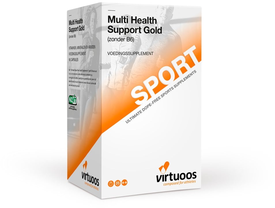 Multi Health Support Gold (Zonder B6) is een innovatieve en hoogwaardige multivitamine die speciaal is afgestemd op de behoeften van sporters. Dit product onderscheidt zich doordat het geen vitamine B6 bevat, terwijl het toch een breed scala aan essentiële vitaminen en mineralen levert ter ondersteuning van gezondheid, weerstand en energie.De multivitamine bevat onder andere vitamine C, ijzer, zink en selenium voor een goede weerstand, B-vitamines voor een optimale energiestofwisseling, en vitamine D, foliumzuur, ijzer en kalium voor de ondersteuning van spieren en het verminderen van vermoeidheid.Belangrijkste eigenschappenDagelijkse aanvulling van essentiële vitaminen en mineralen Ondersteunt het immuunsysteem met vitamine C en zink Bevat geen vitamine B6 Ondersteunt energiestofwisseling en vermindert vermoeidheid Geschikt voor vegetariërsGeadviseerd gebruikDagelijks 1 capsule innemen met een ruime hoeveelheid water. Bij voorkeur in combinatie met een maaltijd.BewarenDroog, koel en donker bewaren, buiten bereik van jonge kinderen.WaarschuwingenDe aanbevolen dosering niet overschrijden. Een gezonde leefstijl en gevarieerde voeding zijn belangrijk. Een voedingssupplement is geen vervanging voor een gevarieerde voeding.IngrediëntenVitamines, hypromellose (capsulehuls), vulstof (aardappelzetmeel), mineralen, granaatappel extract, aroniabes, fruitcomplex, Pycnogenol®, citrusflavonoïden, zonnebloemolie.Aanvullende informatieVrij van bekende allergenen en geschikt voor vegetariërs.Inhoud&productinformatie90 capsules Netto gewicht: 84 gramProduct specificaties